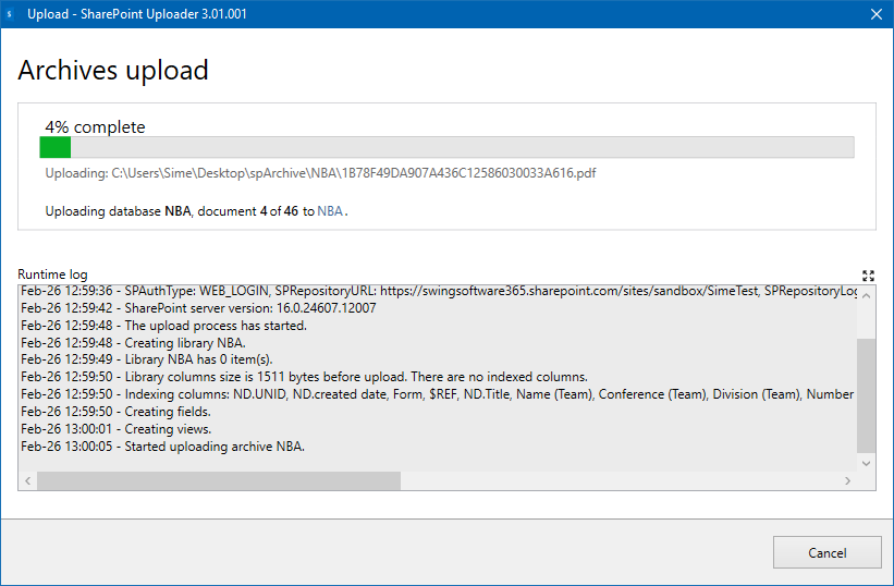 During the upload, the upload progress information will be shown in the popup window: