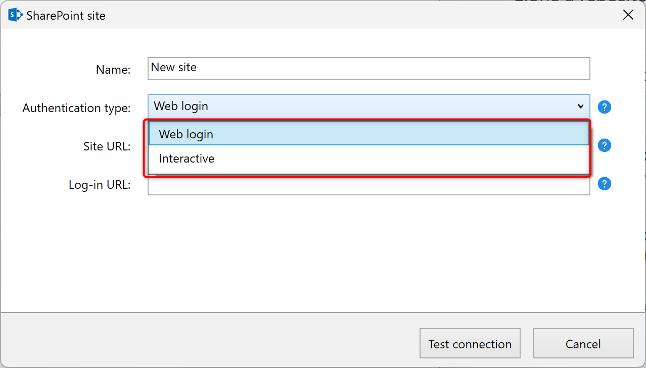 Web login: Log in to SharePoint Online or on-premises using a web browser. Requires claims-based authentication with the FedAuth cookie. If you are previously logged in to SharePoint in the web browser on the machine where you are trying to do the upload, then it is enough to enter the "Name" and "Site URL". You can leave "Log-in URL" empty.