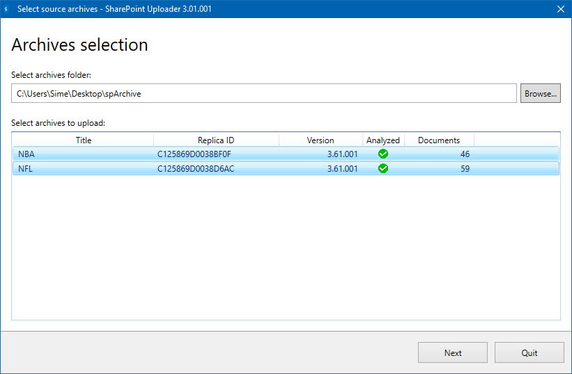 Select one or more archive folders you wish to upload to SharePoint and click Next: