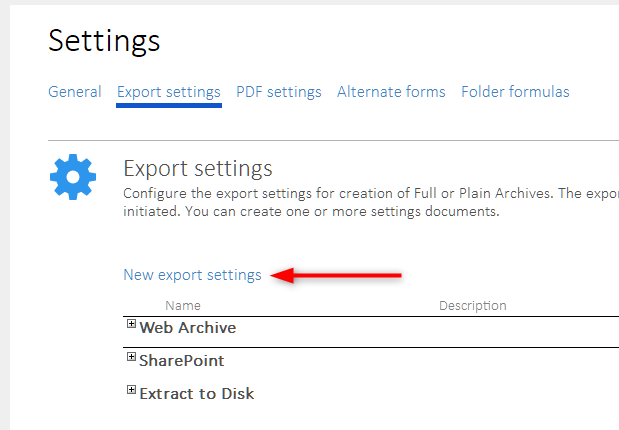 Next, select the archive type (Web Archive, SharePoint, or Extract to Disk), configure your export settings, and save the changes.